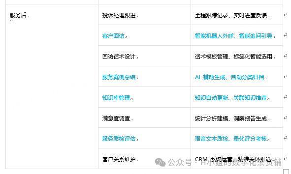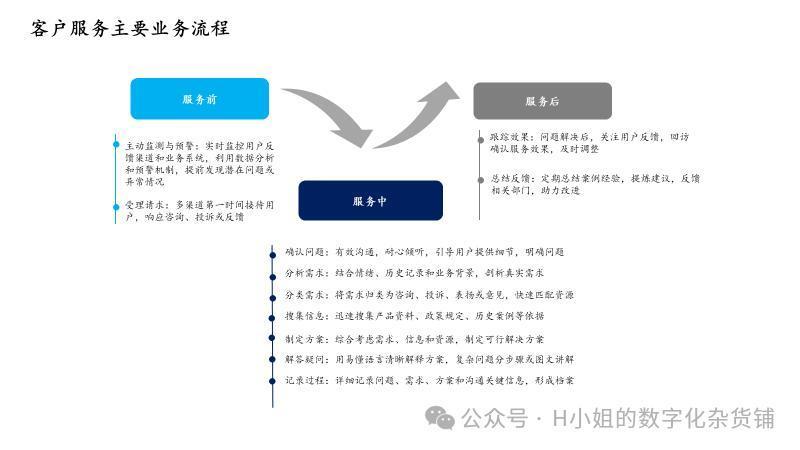 咨询:用户咨询产品、服务、政策相关问题时,智能客服依靠知识库和语义理解能力解答。如产品咨询解答功能参数等,服务咨询告知售后流程等,政策咨询解读相关规范,助力用户决策。投诉:面对用户投诉,智能客服耐心倾听、安抚情绪。产品质量投诉,问清故障后安排退换;服务态度投诉,了解情况后道歉并处理。同时记录分析,避免问题再发生。建议:用户提出产品改进、服务优化等建议,智能客服记录并反馈给相关部门,助力企业依此优化升级。评价:用户评价涵盖产品使用和服务体验,分正面、负面评价。正面评价表示感谢,负面评价深入了解、记录反馈,推动改进。2.2 业务流程前文基于场景的分析,相当于从宏观放大镜的视角分析,而业务流程分析,则直接聚焦在客服业务,从受理前、受理中、受理后对客服业务流程进行梳理: