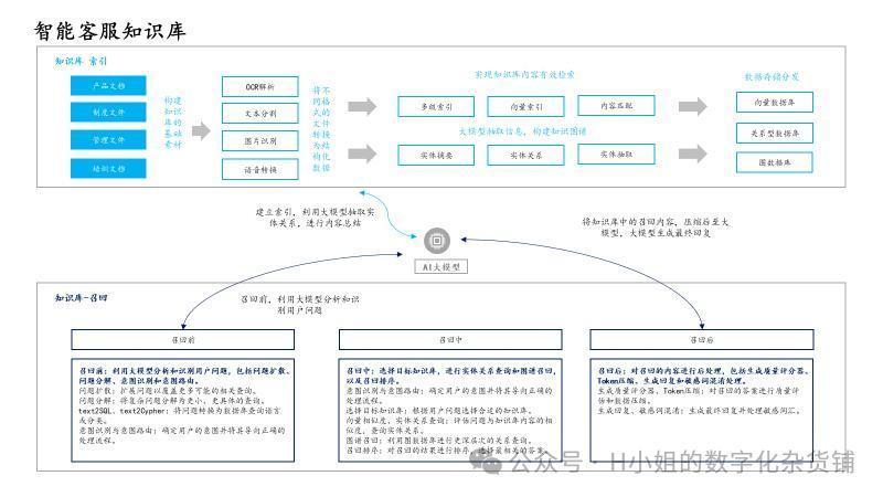 五、基于AI大模型的智能客服搭建(以知识库为例)由于本文篇幅关系,无法全面分析基于人工智能的智能客服搭建方式,所以选取了一个较为典型的功能模块,即基于AI大模型的知识库,通常知识库的底层能力是基于通用性的大模型底层能力的,但由于行业的特性和客户特征,大多数会外挂行业知识库等进行语料喂养。那么基于AI大模型的智能客服搭建知识库流程总体是什么样的呢,下面将进行简要描述。