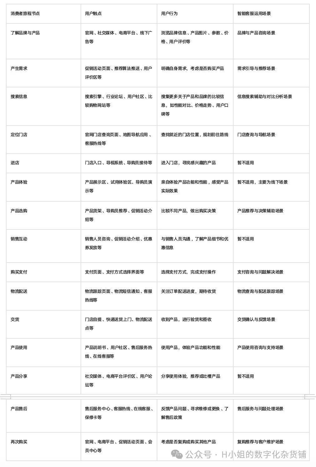 售前阶段涵盖了解品牌与产品、产生需求、搜索信息等环节;售中囊括定位门店、进店、产品体验、产品选购、销售互动(此处特指线下门店销售互动)、购买产品、支付产品、物流配送、交货等流程;售后涉及产品使用、产品分享、产品售后、再次购买等过程。这里更佳的做法是将用户触点&用户行为&客服行为&客服职责&客服okr量化指标结合,由于需要根据实际情况进行分析,下表并未将okr指标一一对应。