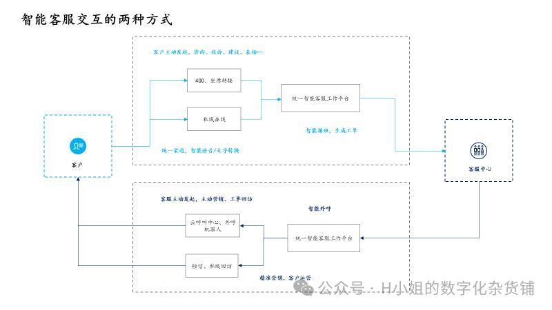 外呼场景:涵盖客服主动发起的营销活动、工单回访等环节。借助云呼叫中心的外呼机器人,依据预设规则筛选目标客户,主动拨打电话进行营销推广或回访。例如,针对新注册用户推送新手礼包引导消费,对近期购买产品的用户询问使用体验并推荐配套产品。同时,结合短信和私域回访,通过短信吸引用户进入私域平台(如企业微信、小程序等),在私域环境中与用户深度互动,提升用户参与度与转化率。客户主动问询场景:当用户通过 400 电话、在线客服等统一渠道主动发起咨询、投诉、建议或表扬等行为时,智能客服借助智能语音 / 文字转换技术,将用户诉求精准传递至统一智能客服工作平台。在此平台上,智能客服迅速识别问题类型和意图,将咨询或投诉精准分配给相应人员或流程,并生成工单,确保用户问题得到及时、有效的处理。